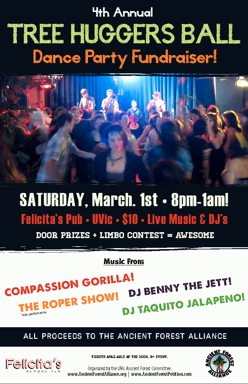 A fan of big trees and great music? Well Saturday Mar. 1st is the 4th Annual "Tree Huggers Ball", a benefit for the Ancient Forest Alliance! Live music, DJ's, door prizes, and more! All proceeds to the AFA. www.AncientForestAlliance.org