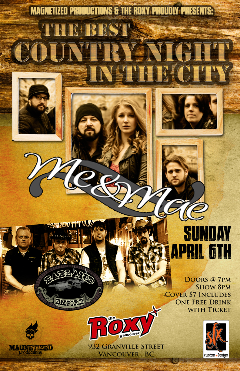 Magnetized Productions & The Roxy Proudly Presents: ( The Best Country Night In The City ) Featuring ME & MAE with Special Guest BADLAND EMPIRE. Sunday, April 6th. Doors @ 7pm, Show 8pm, Cover $7 Includes One Free Drink with Ticket.