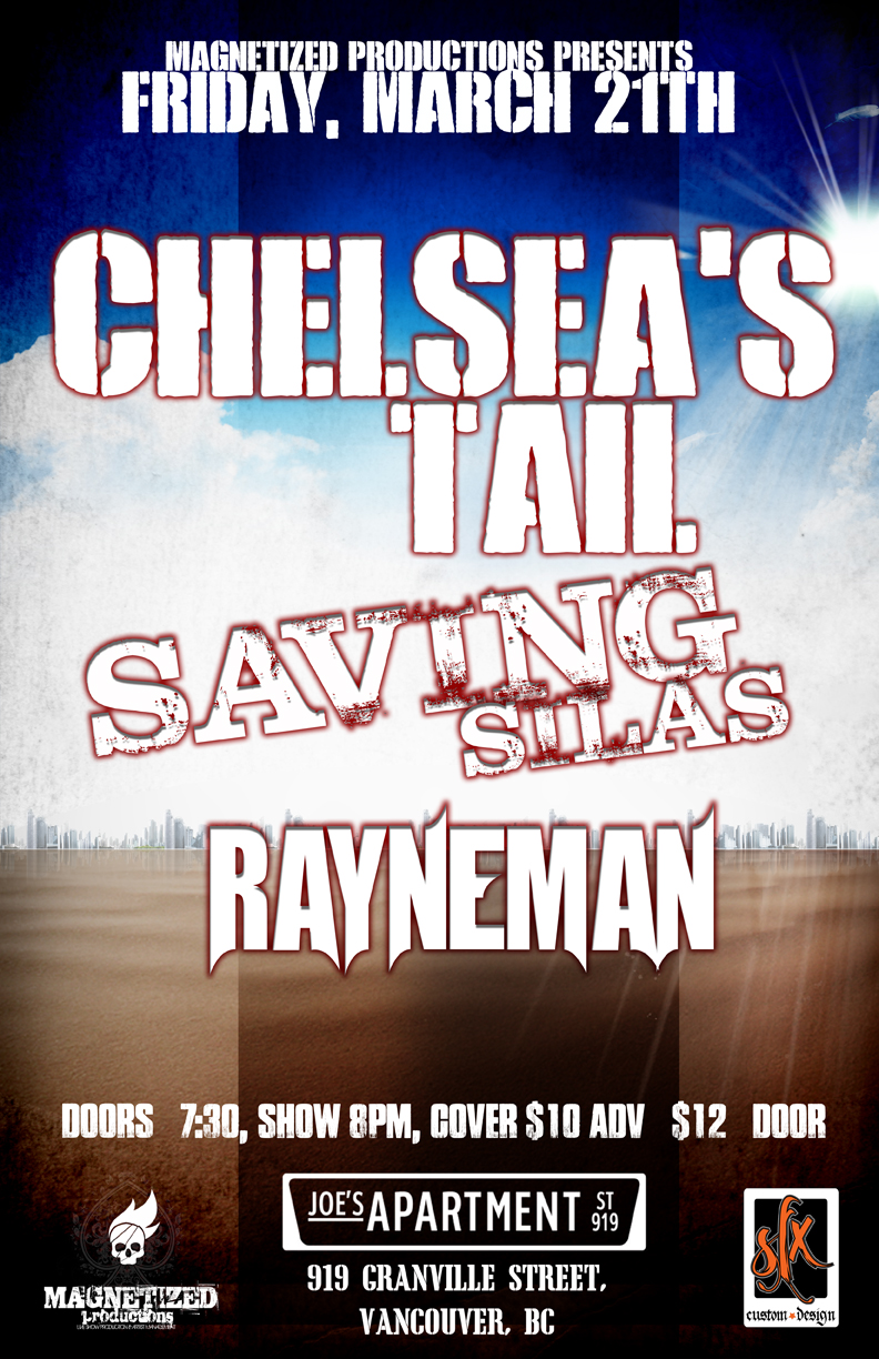 Magnetized Productions Proudly Presents: Chelsea's Tail with Guest Saving Silas & Rayneman. Friday, March 21st @ Joe's Apartment, 919 Granville Street, Vancouver. Doors @ 7:30, Show 8pm, Cover $10 Adv / $12 @ Door