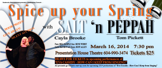 Spice up your Spring is a fundraising concert Sunday, March 16th at Presentation House Theatre in North Vancouver to aid with start- up costs for future productions of Eva Cassidy – How Can I keep from Singing, scheduled for three further runs in 2014. Cayla Brooke, Tom Pickett and the exceptional band of the Eva Cassidy show is reuniting to put on a great evening of music – Jazz, Gospel, Motown, Blues, Standards, Country and maybe even a little funk thrown in for fun. The four piece band is led by Bill Sample on piano and featuring Rene Worst on bass, David Ivaz on guitar and Buff Allen on drums.