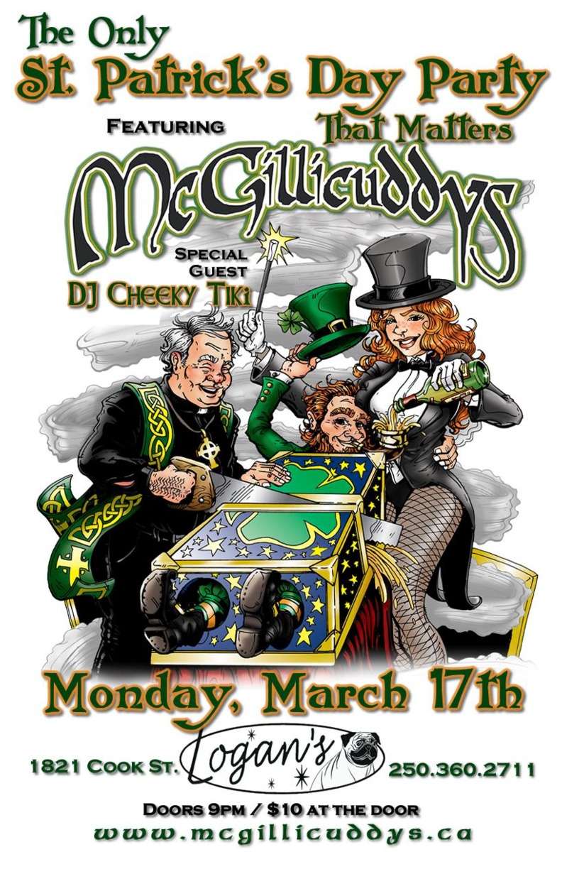 McGillicuddys are heading back to St. Paddy's night groud zero - Logan's (Irish) Tavern of the Damned!!! Don't miss Victoria's ONLY psycho Ceilidh - give the plastic Paddy pubs a miss and check out the real thing. We'll be breaking out all your Irish favourites, bringing back some songs from our back pages, and providing a few surprises for you as well, and DeeJay Cheeky O' Tiki will be spinning all your Celtic punk rock'n'roll faves to keep the party going!!! Wear green, drink green (if you really must; we prefer the black stuff), party like you're green, but try not to let green man strike you down! See you . . .