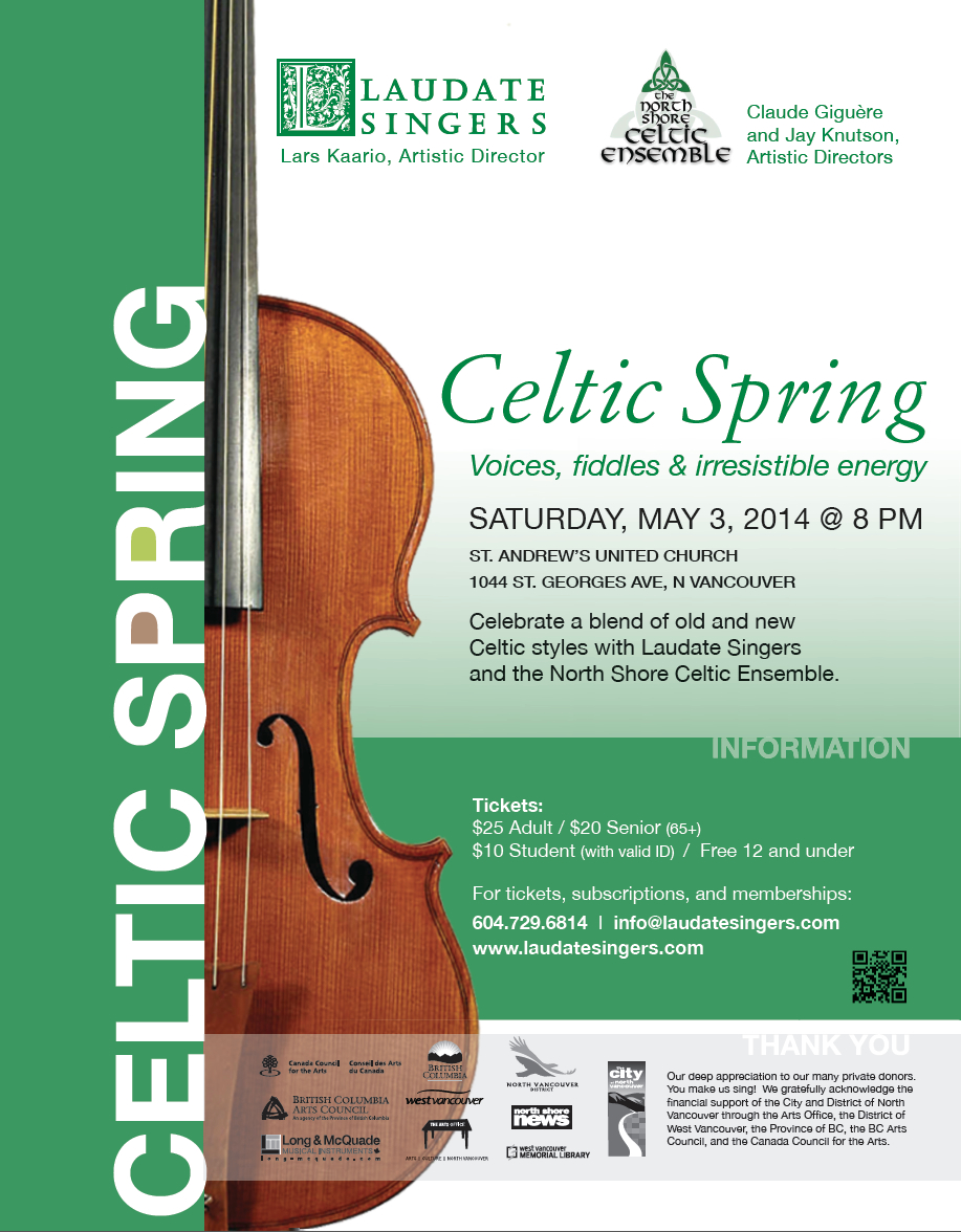 Celebrate a blend of old and new Celtic styles with Laudate Singers and the North Shore Celtic Ensemble. Two of the top groups in the city join together for a concert of voices, fiddles and irresistible energy!