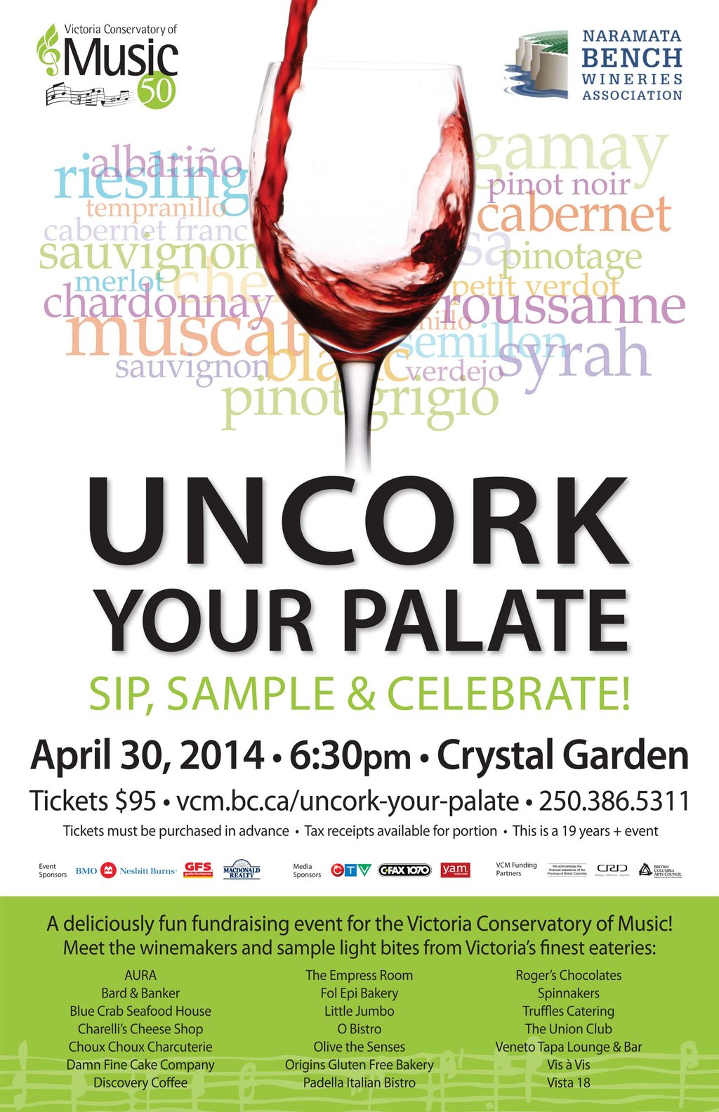Presented at Victoria’s elegant Crystal Garden, Uncork Your Palate is an exciting wine, food and musical experience which raises funds for the Victoria Conservatory of Music. Net proceeds go to support VCM music education, music performance and community music outreach.