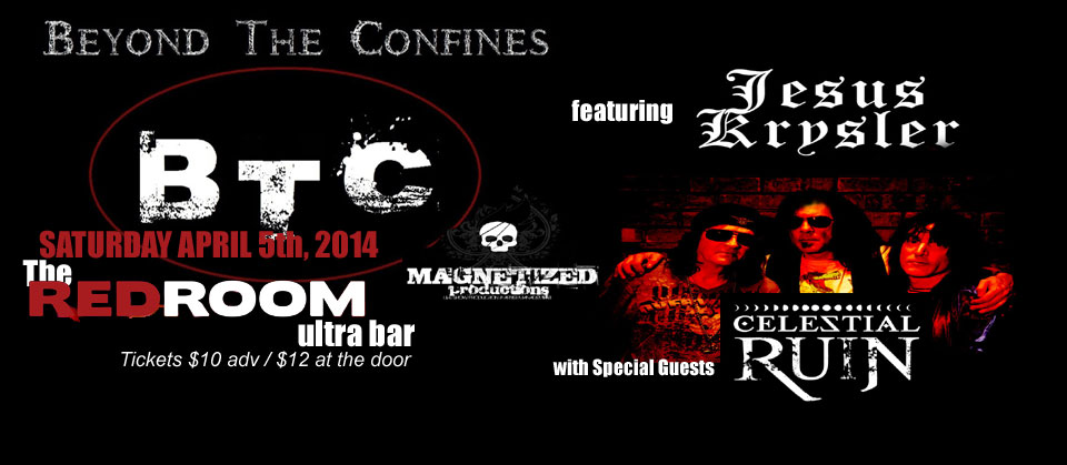 Saturday, April 5th. Beyond The Confines, Jesus Krysler & Guest Celestial Ruin at Red Room Ultra Bar, 398 Richards Street, Vancouver.. Tickets are $10 Adv / $12.00 at the door. Doors @ 8pm
