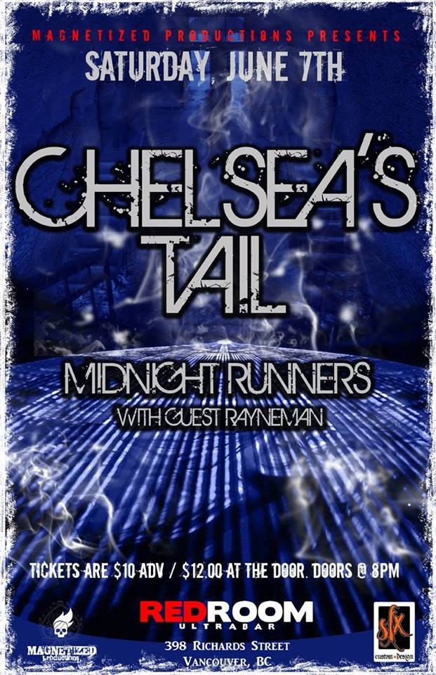Saturday, June 7th, Chelsea's Tail , Midnight Runners with Guest Rayneman at Red Room Ultra Bar, 398 Richards Street, Vancouver.. Tickets are $10 Adv / $12.00 at the door. Doors @ 8pm