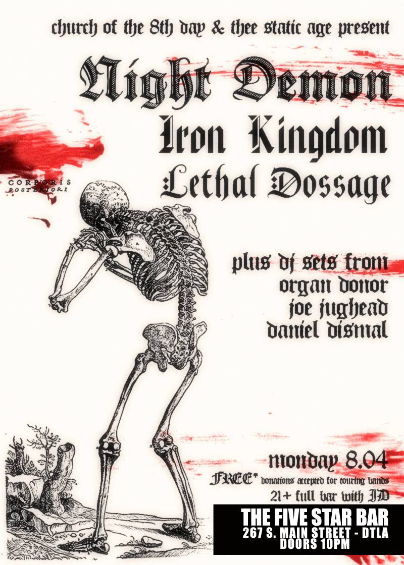 Night Demon, Iron Kingdom, Lethal Dossage @ Five Star Bar DTLA Aug 4 2014 - Dec 25th @ Five Star Bar DTLA