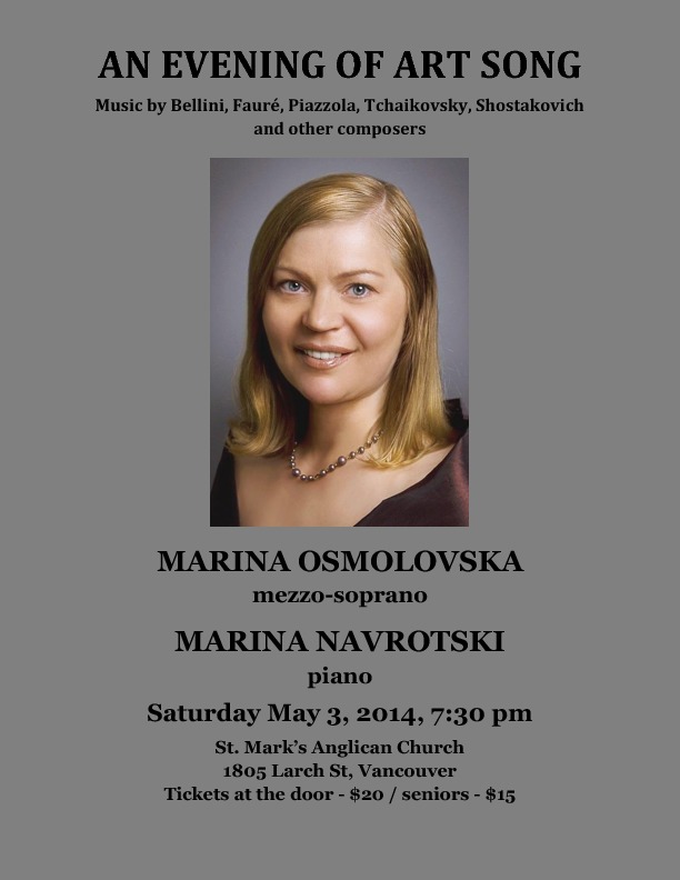 An Evening of Art Song: MARINA OSMOLOVSKA  (mezzo-soprano), MARINA NAVROTSKI  (piano) @ St. Mark's Anglican Church May 3 2014 - Feb 4th @ St. Mark's Anglican Church