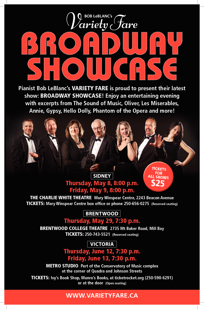 Bob LeBlanc’s Variety Fare Broadway Showcase: Bob LeBlanc, Merissa Cox, Stan Davis, Kristy Gislason, Dwayne Gordon, Timothy Kyle, Lisa Tinney @ Brentwood College Theatre May 29 2014 - Feb 9th @ Brentwood College Theatre