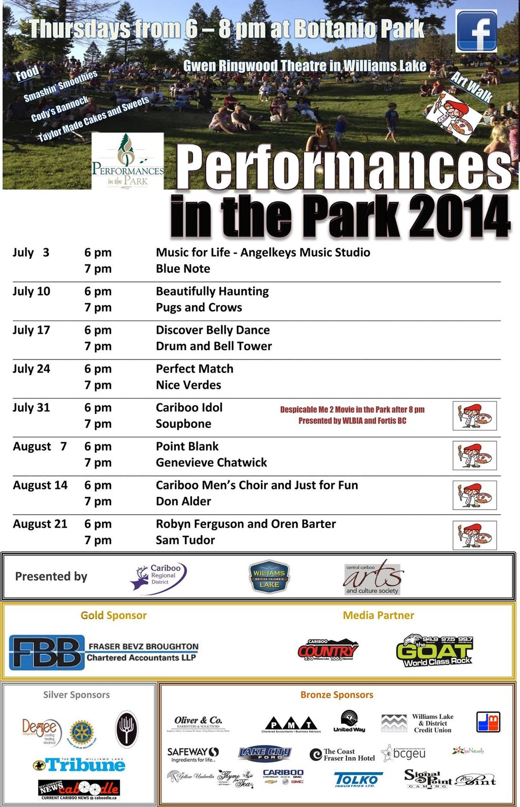 The Central Cariboo Arts and Culture Society is happy to announce that Performances in the Park, the outdoor free summer concert series, will begin on Thursday, July 3rd at 6:00pm and will continue each Thursday evening at the same time at the Gwen Ringwood Theatre in Williams Lake’s Boitanio Park until August 21st. Once again, with the support of the City of Williams Lake and the Cariboo Regional District, the Central Cariboo Arts and Culture Society will be presenting this event under the management of Angela Sommer of Angelkeys Music Studio.