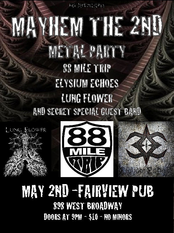 MAYHEM THE 2ND METAL PARTY: 88 Mile Trip, Elysium Echoes, Lungflower, SECRET MAYHEM BAND @ Fairview Pub May 2 2014 - Feb 4th @ Fairview Pub