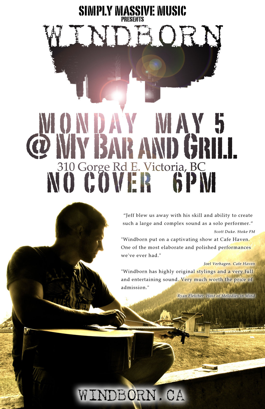 Windborn is back in Victoria for one show at My Bar! Jeff has toured full-time as a one-man band for many years under the name of Windborn. The size of the sound coming from just one musician is unlike anything you’ve ever heard or seen before. Whether it's a mellow house concert or a pub, the energy and strength of the music is undeniable. Jeff’s unique sound has landed him on stage with some big name acts, including John and Roy, Mathew Barber, and Honeymoon Suite. His guitar playing lays the foundation of every song and is truly distinctive. He plays rhythm and lead lines at the same time, creating some of the biggest and most percussive riffs you'll ever hear on the guitar. On top of all that, Jeff lays complex beats with foot percussion and loop sampling, and cuts through everything with powerful vocals. Visit www.windborn.ca for more info and tour schedule.
