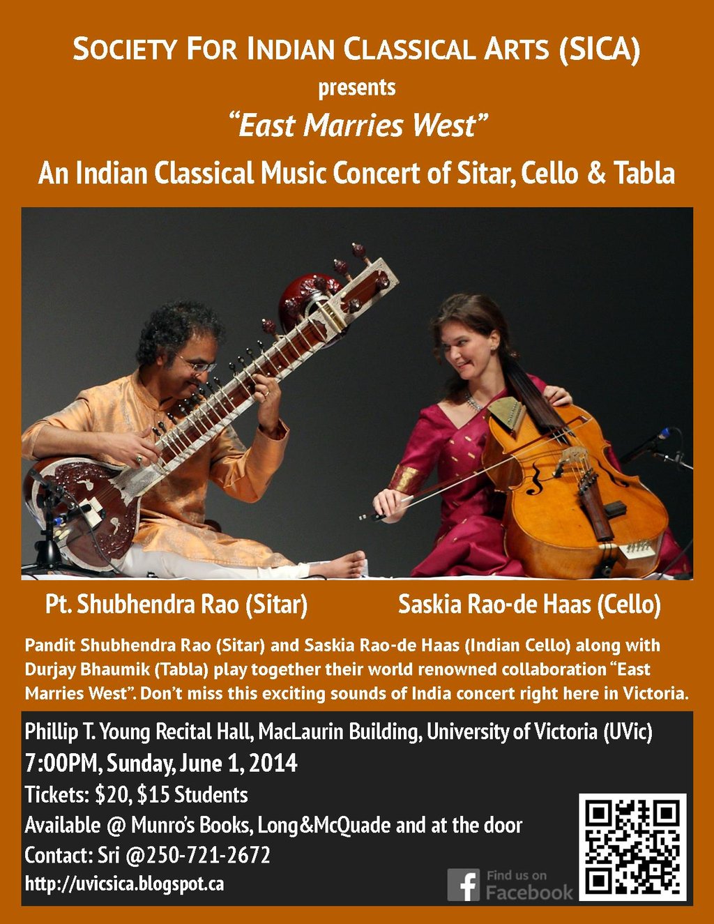 Society For Indian Classical Arts (SICA), a student club at the University of Victoria presents an Indian (Hindustani) Classical Music concert of Sitar, Cello and Tabla "East Marries West" on Sunday, June 1, 2014. Pandit Shubhendra Rao (Sitar) and Saskia Rao de Haas (Indian Cello) along with Durjay Bhaumik (Tabla) play together their world renowned collaboration “East Marries West”. Don't miss this opportunity to see these wonderful artists perform here in Victoria. Please see SICA's webpage http://web.uvic.ca/~sica/ for a poster and more information about the artists.