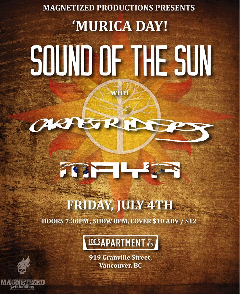 Magnetized Productions Proudly Present: SOUND OF THE SUN, CARPETRIDERS with guest MAYA. Friday, July 4th @ Joe's Apartment, 919 Granville Street, Vancouver. Doors @ 7:30, Show 8pm, Cover $10 Adv / $12 @Door