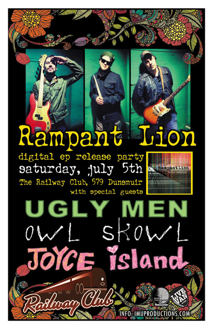 . Saturday, July 5th IMU presents RAMPANT LION DIGITAL EP RELEASE w/ OWL SKOWL, UGLY MEN & JOYCE ISLAND @ The Railway Club, 579 Dunsmuir . Show 10pm / $10 cover