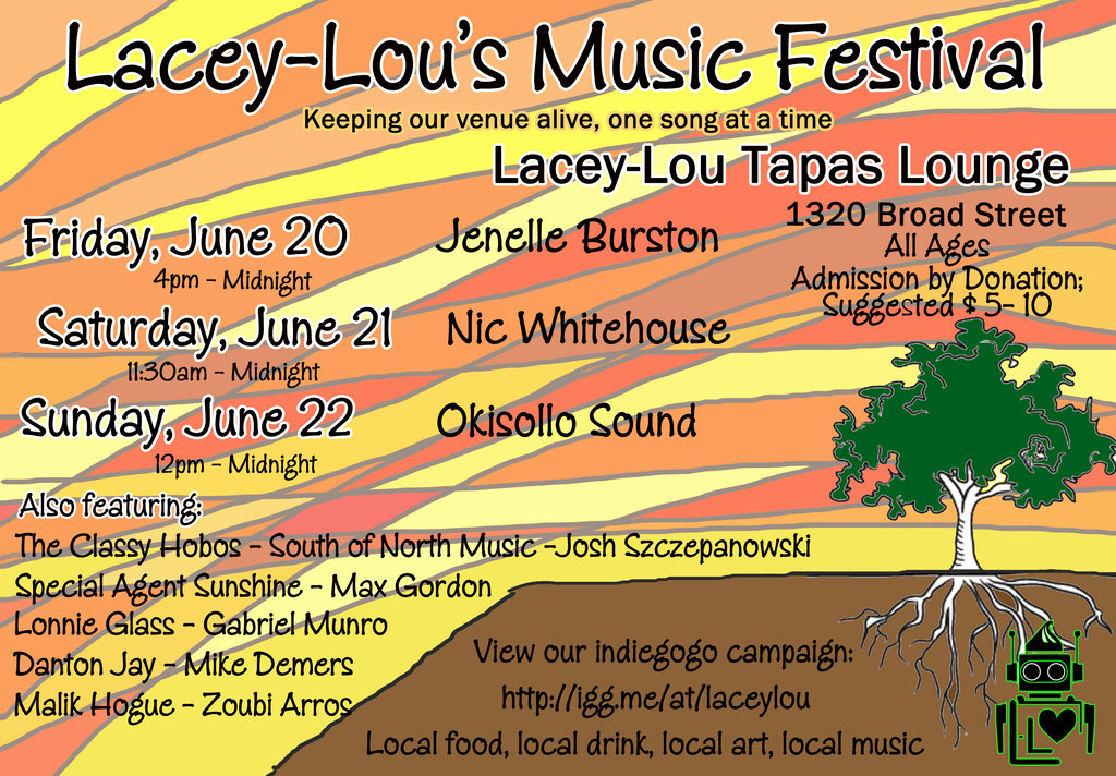 Lacey-Lou Tapas Lounge presents the Lacey-Lou Music Festival, part of Indiegogo fundraising campaign to raise operating capital for the venue, featuring performances by Jenelle Burston, Nic Whitehouse, South of North Music, Okisollo Sound, The Classy Hobos, Josh Szczepanoski, Special Agent Sunshine, Max Gordon, Lonnie Glass, Gabriel Munro, Danton Jay, Mike Demers, Malik Hogue and Zoubi Arros Friday June 20 to Sunday June 22, 2014.
