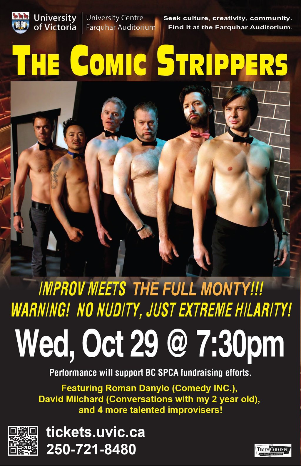 A fictitious male stripper troupe (played by a cast of some of Canada’s best improvisational comedians) perform a scared shirtless improv comedy show. These guys try to be sexy… it just comes out funny. Constantly grooving and gyrating in between scenes they banter with the crowd and perform their hilarious twist on improv sketches. They sing, they “dance”. These guys are oiled up and ready to make you laugh at them.