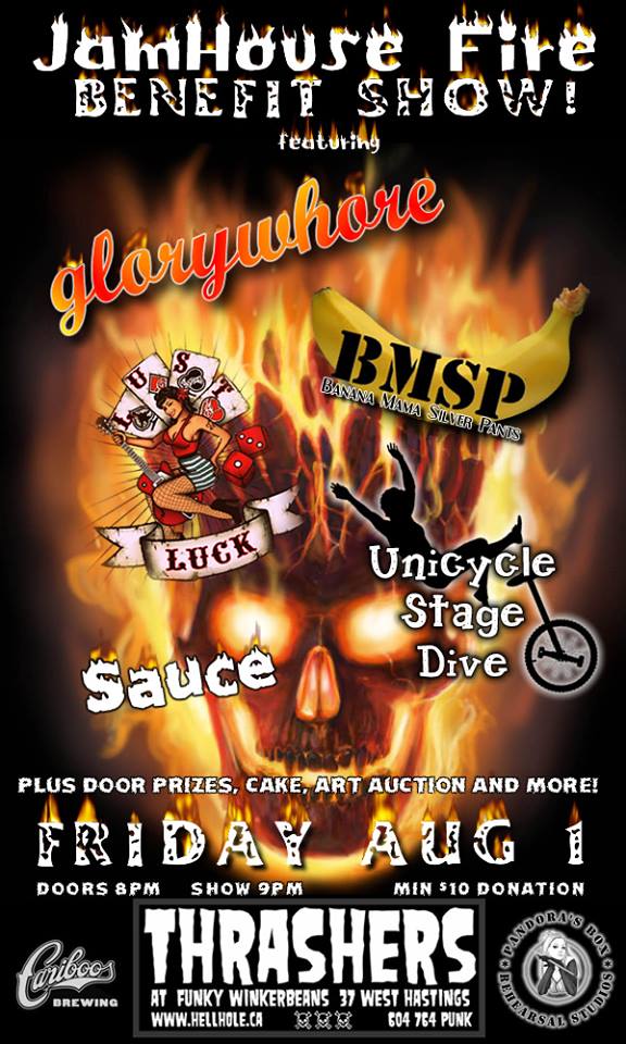 * FUNDRAISER FOR ZIG'S BURNT HOUSE *: Glorywhore, Banana Mama Silver Pants, UNICYCLE STAGEDIVE, Lust 4 Luck, SAUCE @ Funky Winker Beans Aug 1 2014 - Feb 24th @ Funky Winker Beans