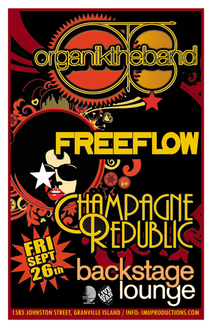. Friday, September 26th IMU presents ORGANIK THE BAND, FREEFLOW & CHAMPAGNE REPUBLIC @ The Backstage Lounge, 1585 Johnston Street, Granville Island. Show 10pm / $10 cover