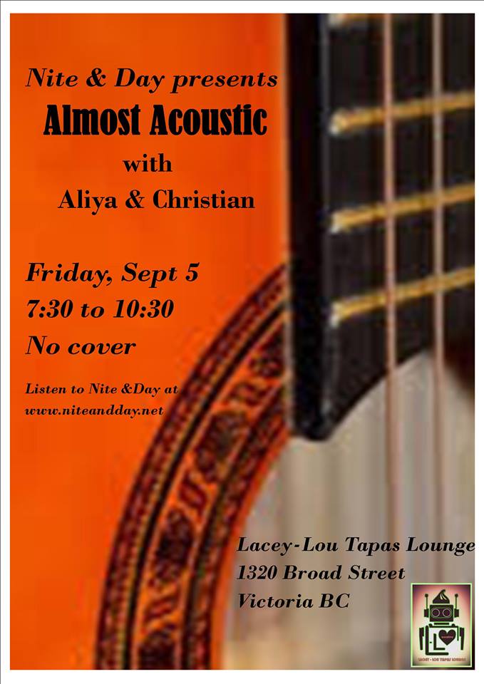 Nite and Day presents “Almost Acoustic” with singers Aliya K and Christian G at the hip Lacey-Lou Tapas Lounge. With a short set hosted by Chris A, our Nite and Day women will sing their favorites accompanied by one guitar. The band will leave behind the big amps, bass, and drums for the larger dance venues. Lacey-Lou is meant to have a simpler, gentler musical experience.