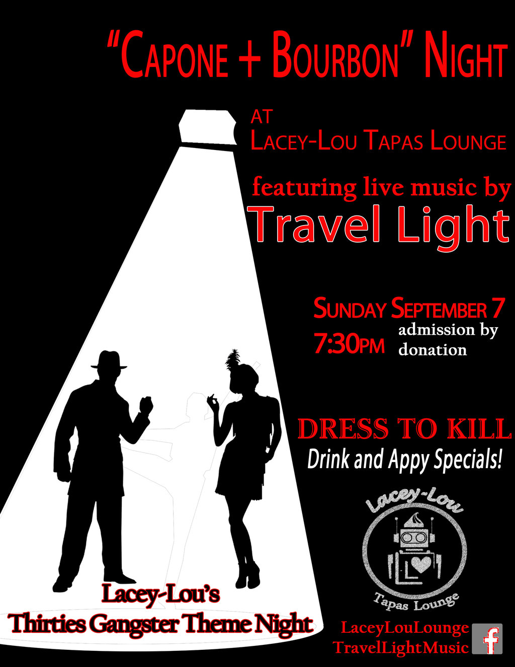 Dress to Kill, in your best 30s Gangster costume and enjoy Victoria local band, TRAVEL LIGHT. Themed Drink + Appy Specials!