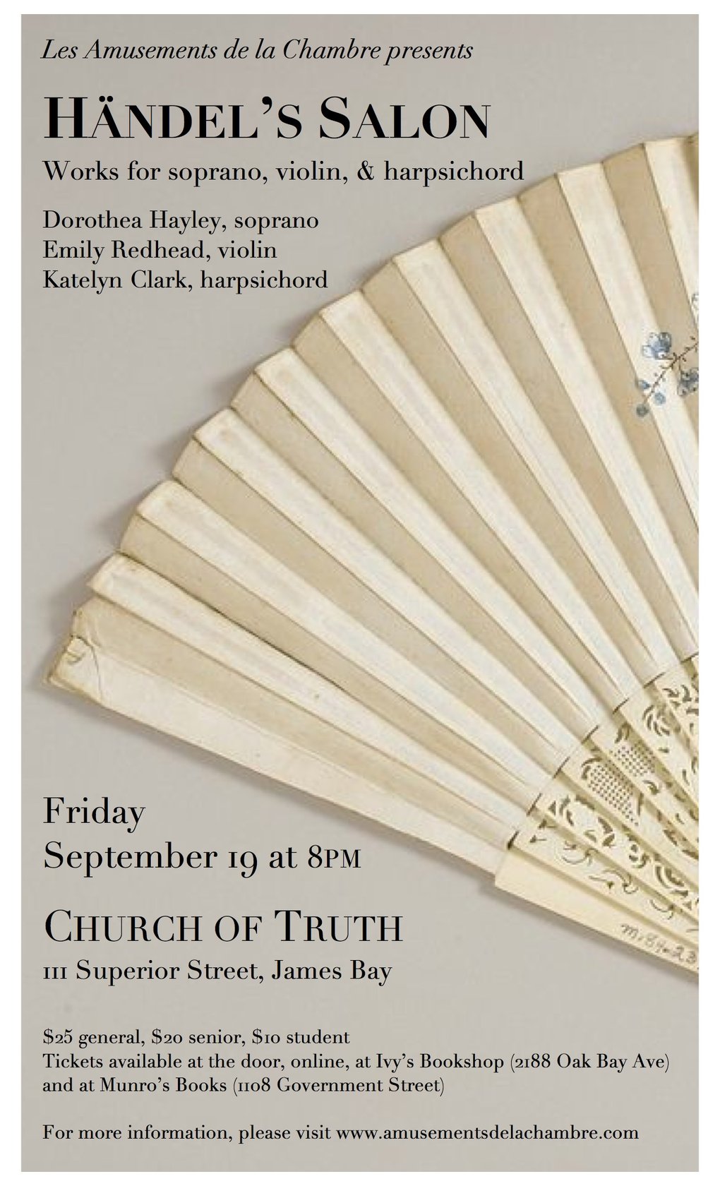 Tickets: $25 general, $20 seniors, $10 students. Tickets available at the door, or in advance at Ivy’s Bookshop (2188 Oak Bay Avenue), Munro’s Books (1108 Government Street), and online at www.amusementsdelachambre.com.