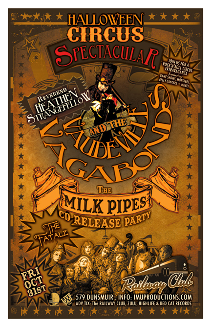 . Friday, October 31st IMU presents HALLOWEEN CIRCUS SPECTACULAR! REVEREND HEATHEN STRANGEFELLOW & The VAUDEVILLE VAGABONDS, The MILK PIPES CD Release Party & The FATALZ @ The Railway Club, 579 Dunsmuir. 9pm / $12 Adv tickets: The Railway Club, HighLife, Zulu & Red Cat Records. $15 cover at the door