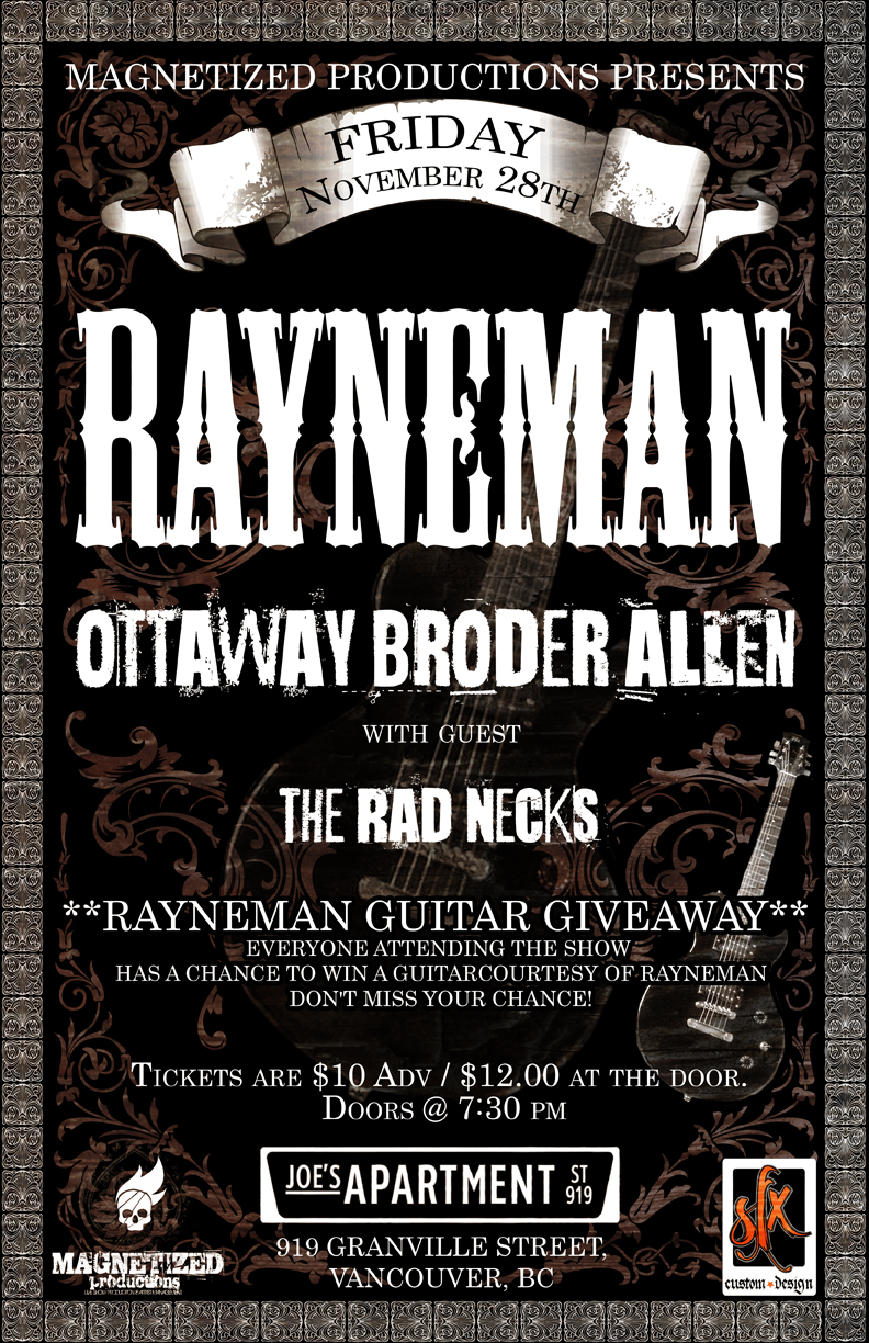 Rayneman, Ottaway Broder Allen with Guest The Rad necks at Joe's Apartment, 919 Granville Street, Vancouver.. Tickets are $10 Adv / $12.00 at the door. Doors @ 7:30 pm