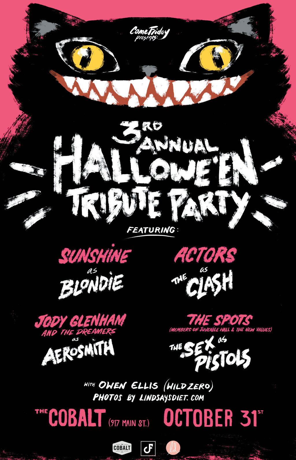 Come Friday's 3rd Annual Hallowe'en Tribute Party: ACTORS (as The Clash), Sunshine (as Blondie), Jody Glenham (as The Dreamers & Aerosmith), The Spots (The Sex Pistols)