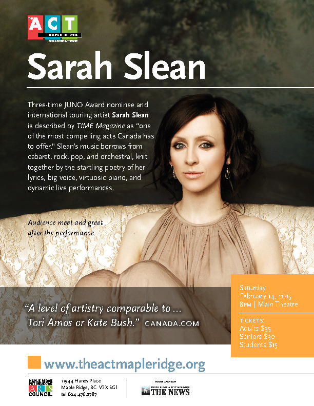Three-time JUNO Award nominee and international touring artist, Sarah Slean, is described by TIME Magazine as “one of the most compelling acts Canada has to offer”. Slean’s music has borrowed aspects of cabaret, rock, pop, and orchestral: all knit together by the startling poetry of her lyrics, big voice, virtuosic piano-playing, and dynamic live performances.