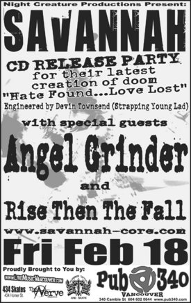 Savannah CD Release Party for their new 'Hate Found...Love Lost" cd.: Savannah, Angel Grinder, Rise Then The Fall @ Pub 340 Feb 18 2005 - Jan 15th @ Pub 340