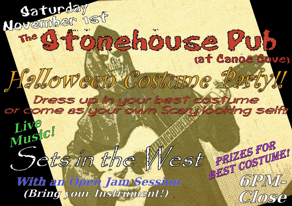 Come on out to the Stonehouse Pub at Canoe Cove Marina for a great Halloween Costume Party- wear your best costume or come as you are, everyone welcome! There will be an open jam session in between and after the band so bring your instrument!