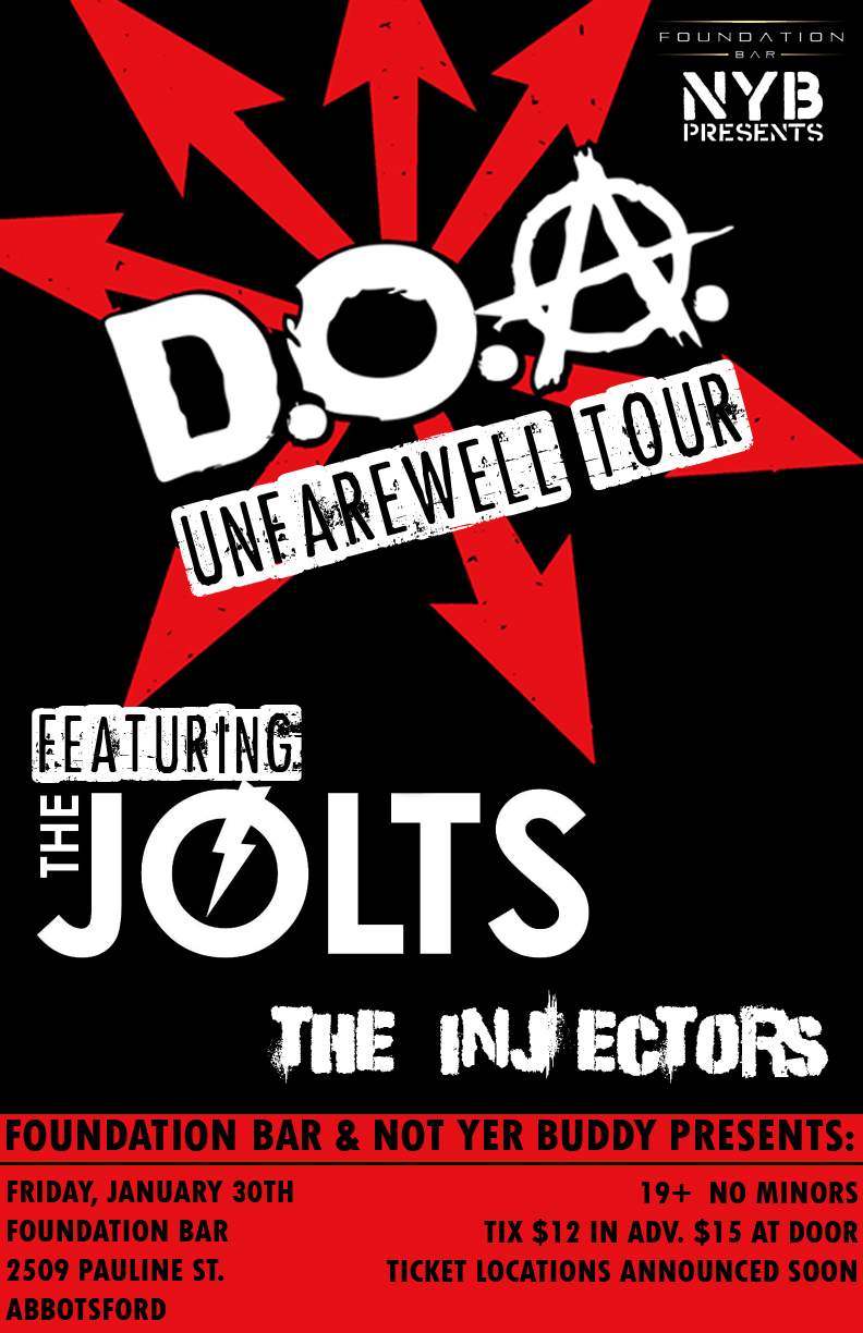 D.O.A.'s unfarewell tour is making a stop in stAbby and with our pals Paddy and Mike (Bc/Dc & Circle the Wagons) enlisted in the line up we are super stoked to see the latest transformation of this seminal hardcore punk juggernaut ... featuring The Jolts and The INJECTORS, this bill is nothing short of amazing!
