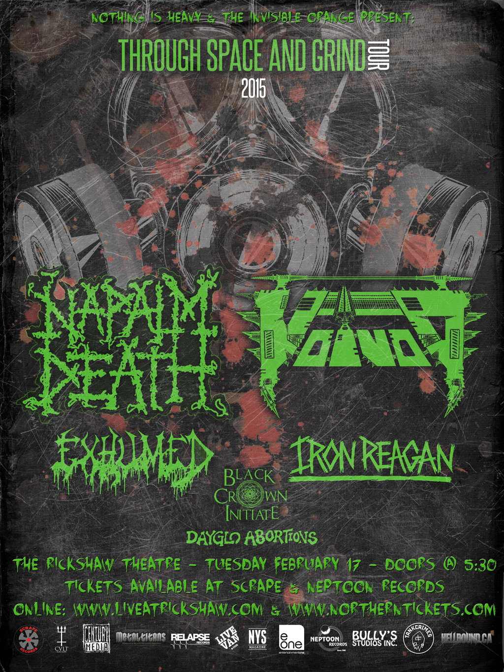 Decibel Magazine"s "Through Space And Grind Tour": Napalm Death, Voivod, Exhumed, Iron Reagan, Dayglo Abortions, Black Crown Initiate @ Rickshaw Theatre Feb 17 2015 - Jan 29th @ Rickshaw Theatre