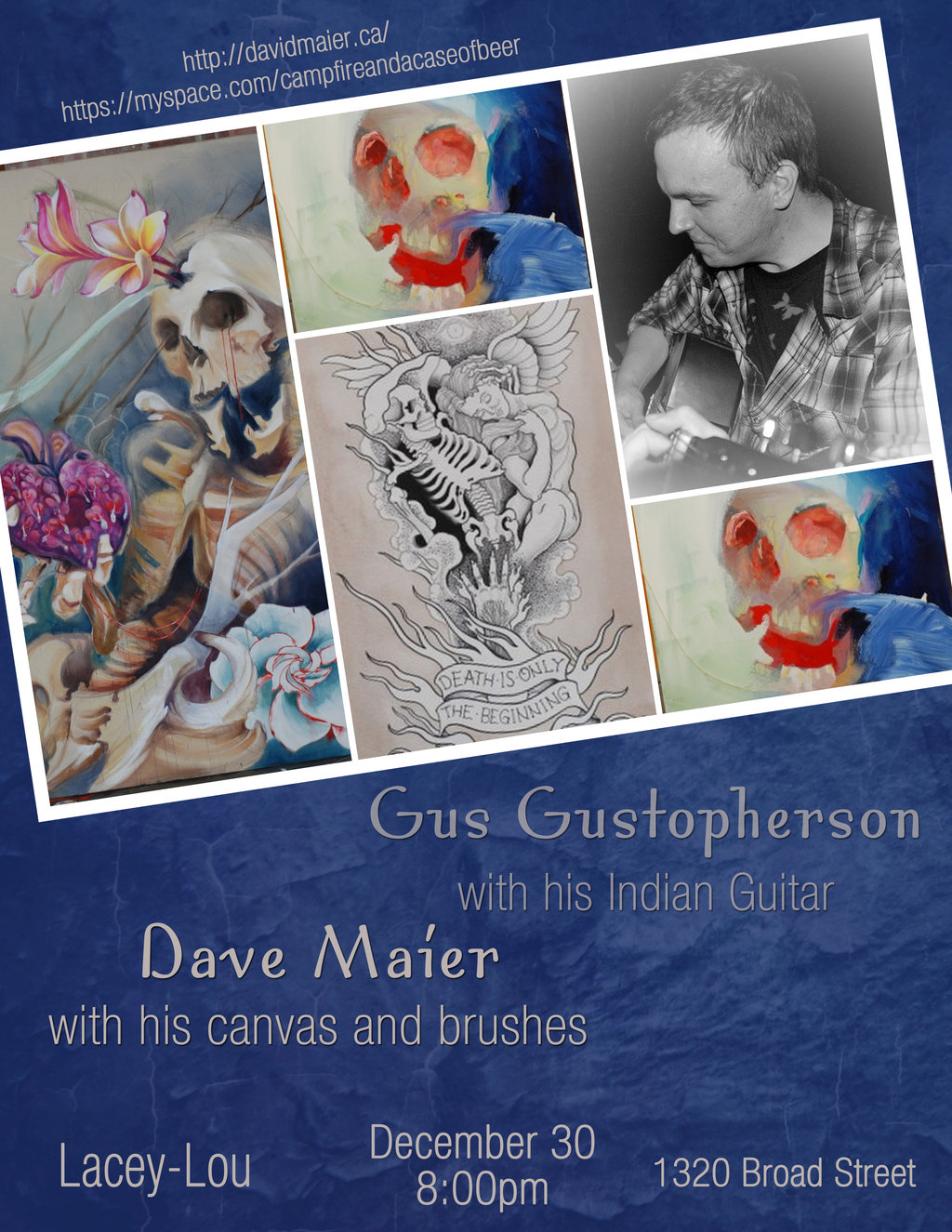 Gus Gustopherson with a guitar recently purchased on the streets of Pondicherry, India will play music you have heard before, some music which isn't his that you haven't heard before, and music he wrote which you also haven't heard before all while his buddy Dave, a man better known for inflicting his unique style of artistic pain on people in tattoo parlours throughout Western Canada, picks up paint brushes and channels the collective consciousness of the bar and pours it on to the canvas. The two of them will take care of all this while you drink and eat whatever you want from Lacey-Lou's fantastic menu.