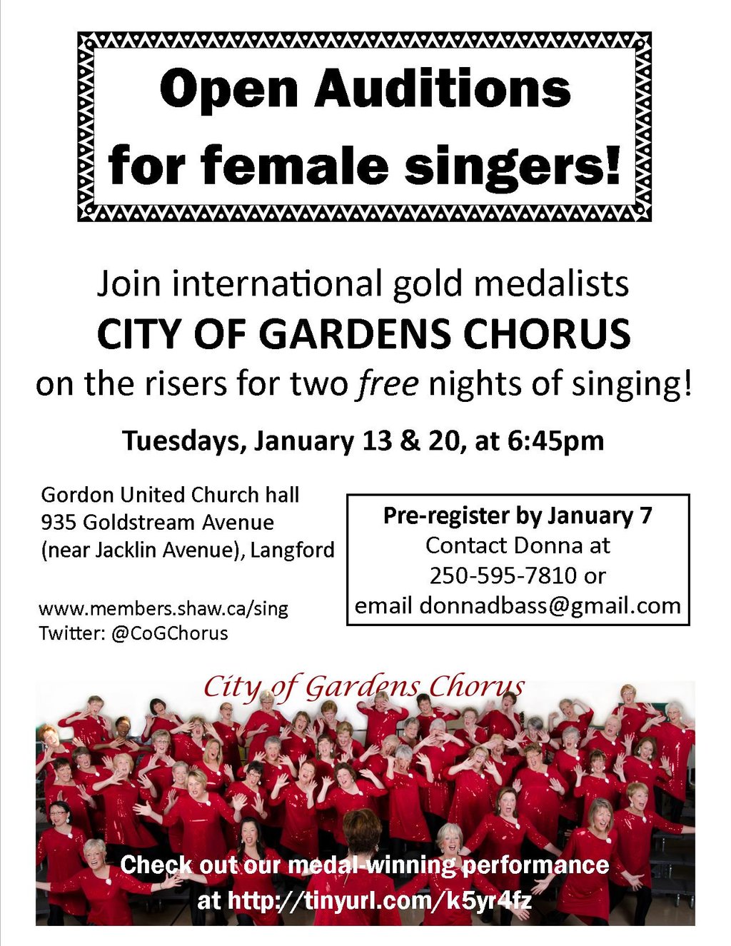 Greater Victoria's CITY OF GARDENS CHORUS invites female singers of all ages to join them on the risers on January 13 & 20 for two FREE nights of singing. PRE-REGISTER BY JANUARY 7 with Donna at [email protected] or 250-595-7810.