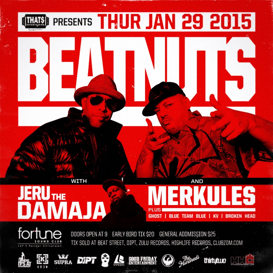 The Beatnuts, JERU THE DAMAJA, MERKULES, rob manthorne, Blue Team Blue, KV, Broken Head @ Fortune Sound Club Jan 29 2015 - Jan 17th @ Fortune Sound Club