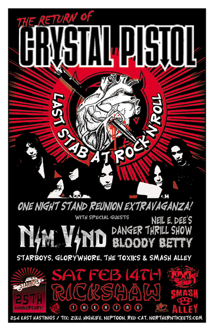 . Saturday, February 14th IMU presents CRYSTAL PISTOL's Last Stab At Rock'n'Roll! w/ NIM VIND, DANGER THRILL SHOW, BLOODY BETTY, STARBOYS, The TOXIKS, GLORYWHORE & SMASH ALLEY @ The Rickshaw, 254 East Hastings St . Tickets $15 @ The Rickshaw, Zulu, HighLife, Red Cat & Northern Tickets: http://northerntickets.com/events/crystal-pistols-last-stab-at-rocknroll / Doors 7pm / Show 7:15 sharp!