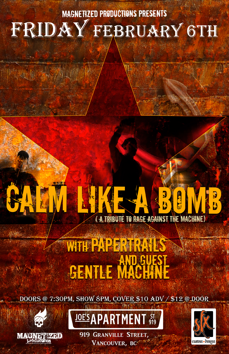 Magnetized Productions Present: Calm Like A Bomb :( A Tribute to Rage Against The Machine), with PaperTrails and Guest Gentle Machine. Friday, February 6th at Joe's Apartment, 919 Granville Street, Vancouver. Doors @ 7:30pm, Show 8pm, Cover $10 Adv / $12 @ Door