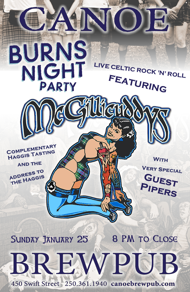 Sunday January 25, 2014, 8:00 PM to late: Join McGillicuddys at Canoe Brewpub for Victoria's most Celtic punk rockin' Robbie Burns Night party. Truth to tell, this one has become even more fun than St. Paddy's (no tossers in dollar store leprechaun outfits for a start!), with a great atmosphere for the whole family - assuming your family is bunch of boozy, haggis eating, Celtic-punk rockers. With guests Morag MacNeil on pipes, and Morgan Onda on the sax, expect the unexpected, and a special gig. As usual, there will be the Address to the Haggis and a complementary haggis tasting. Kilts recommended, claymores less so. No Cover, so don't be late!