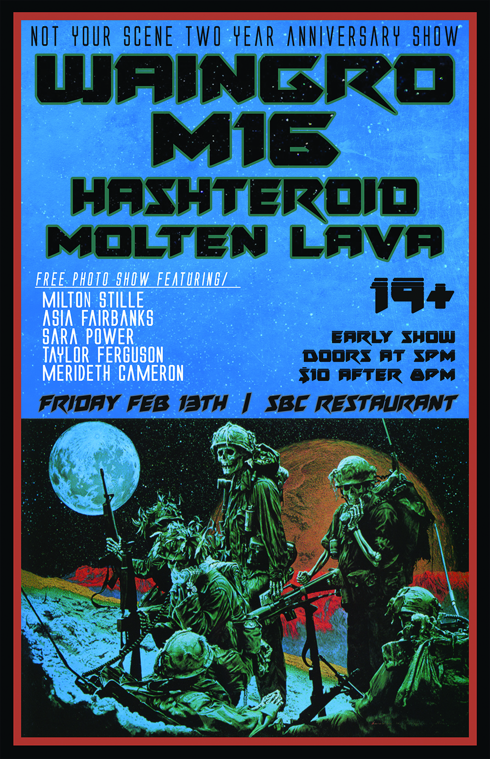 Not Your Scene's Two Year Anniversary Show: Waingro, M16, Hashteroid , Molten Lava @ SBC Restaurant Feb 13 2015 - Feb 21st @ SBC Restaurant