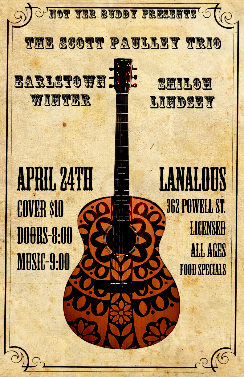 an intimate evening of deep, dark and delicious alternative country/ folk down at LanaLou's with Shiloh Lindsey, Earlstown Winter and The Scott Paulley Trio