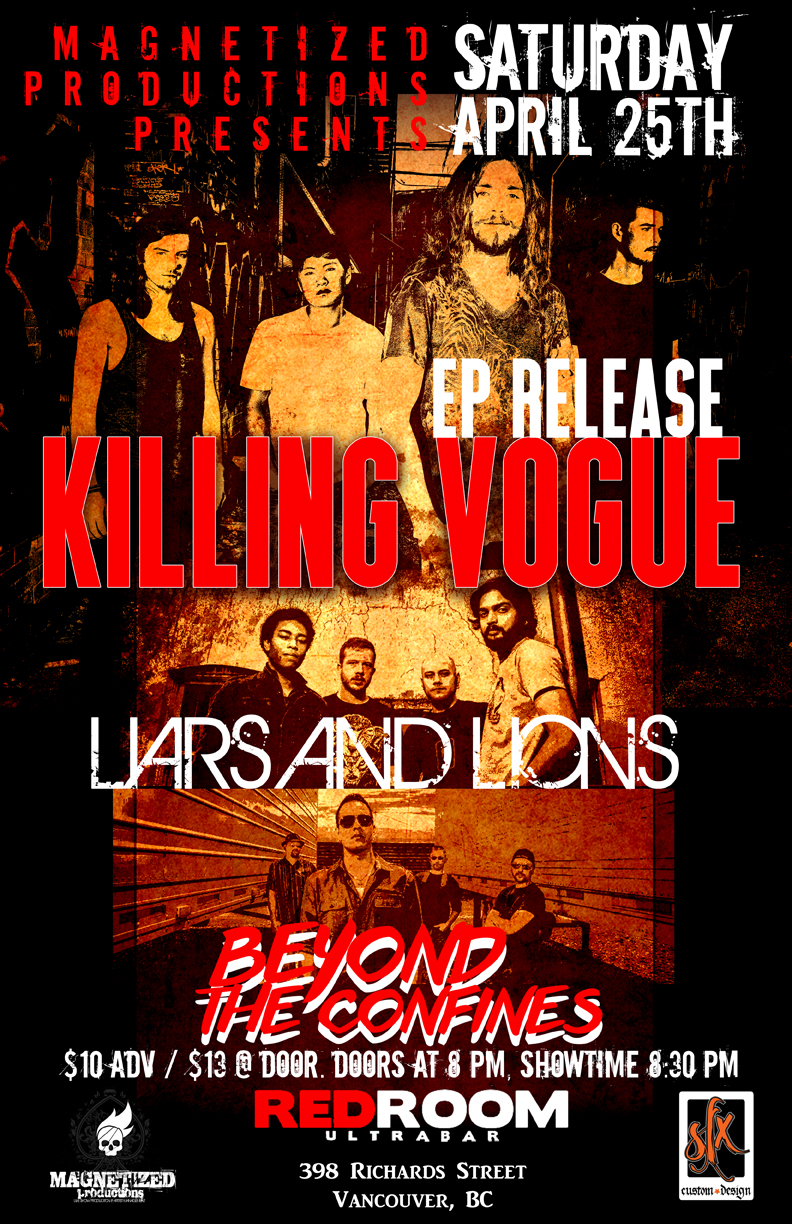 Magnetized Productions Present: Killing Vogue EP Release with Liars and Lions with Guest Beyond The Confines. Saturday, April 25th at Red Room Ultra Bar, 398 Richards Street, Vancouver. $10 Adv / $13 @ Door. Doors at 7;30 pm, Showtime 8:15 pm