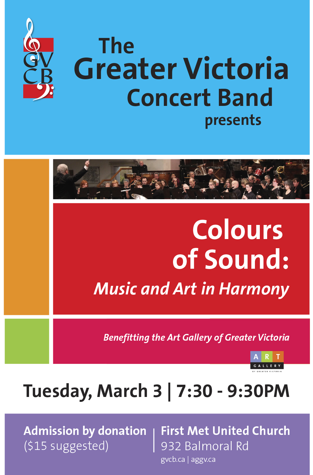 The Greater Victoria Concert Band's Senior Band will perform an evening of music inspired by colour at this benefit concert for The Art Gallery of Greater Victoria. Admission by donation ($15 suggested).