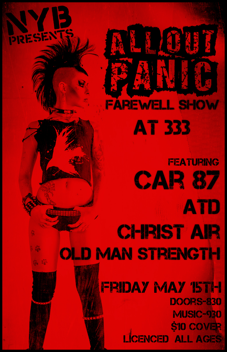 ALL OUT PANIC are packing it in but not without one more All Ager Rager of a party, a deadly line up and a fuckload of friends ...