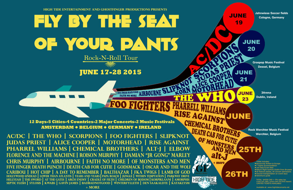 FLY BY THE SEAT OF YOUR PANTS ROCK-N-ROLL TOUR: AC/DC, Foo Fighters, Scorpions, Judas Priest, Alice Cooper, Slipknot, Motorhead, THE WHO, Rise Against, Chemical Brothers, Alt-J, + many more @ VARIOUS VENUES ACROSS EUROPE Jun 1 2015 - Jan 14th @ VARIOUS VENUES ACROSS EUROPE