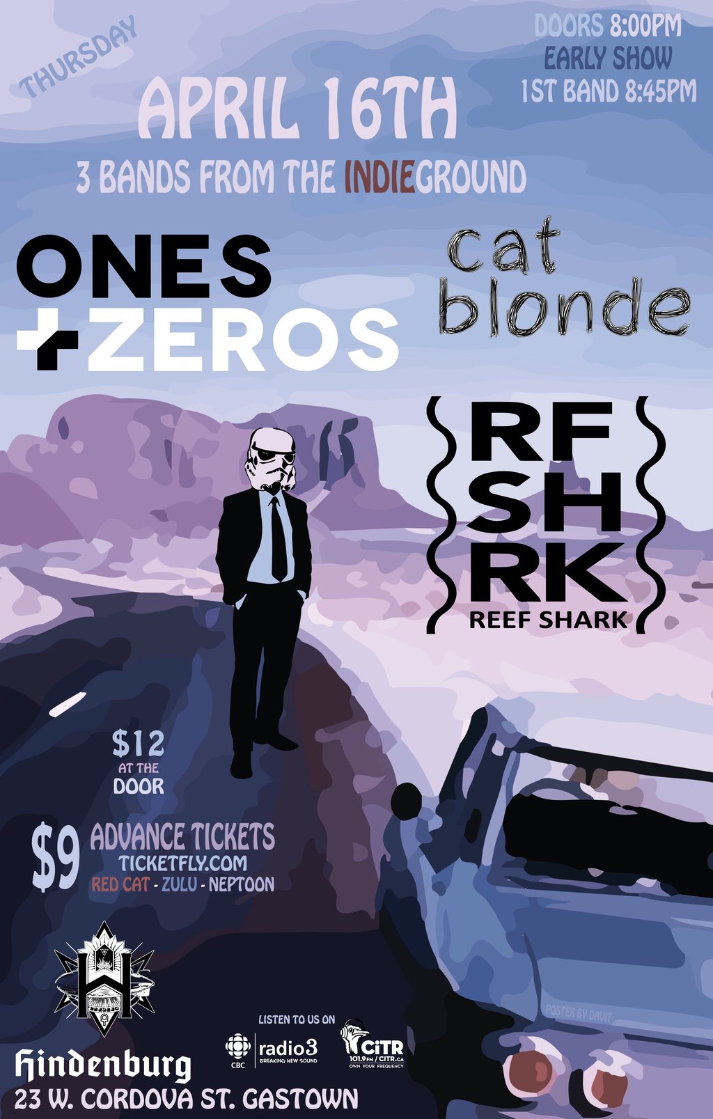Ones&Zeros, Reef Shark & Cat Blonde at the Hindenburg. Early show. Advance tickets $9 at ticket fly.com