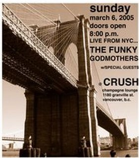 NEW YORK CITY'S OWN FUNKY GODMOTHERS LAND IN VANCOUVER! PERFORMING AT Crush Champagne Lounge on Granville LIVE FUNK/GARAGE/ROCK MOB PERFORMING SONGS YOU KNOW AND SONGS YOU DON'T. 15 YEAR HISTORY OF GOING STRONG IN NYC, NOW IN YOUR BACKYARD FOR ONE WEEKEND ONLY. COME OUT TONIGHT! [email protected]