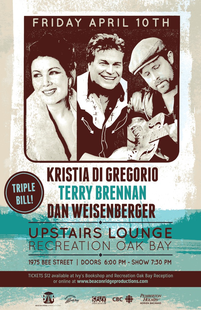 An evening with three of Victoria's most outstanding singer-songwriters! All three will share the stage providing a unique opportunity to enjoy their varied backgrounds, beautiful song-writing and musical stylings in an intimate setting.