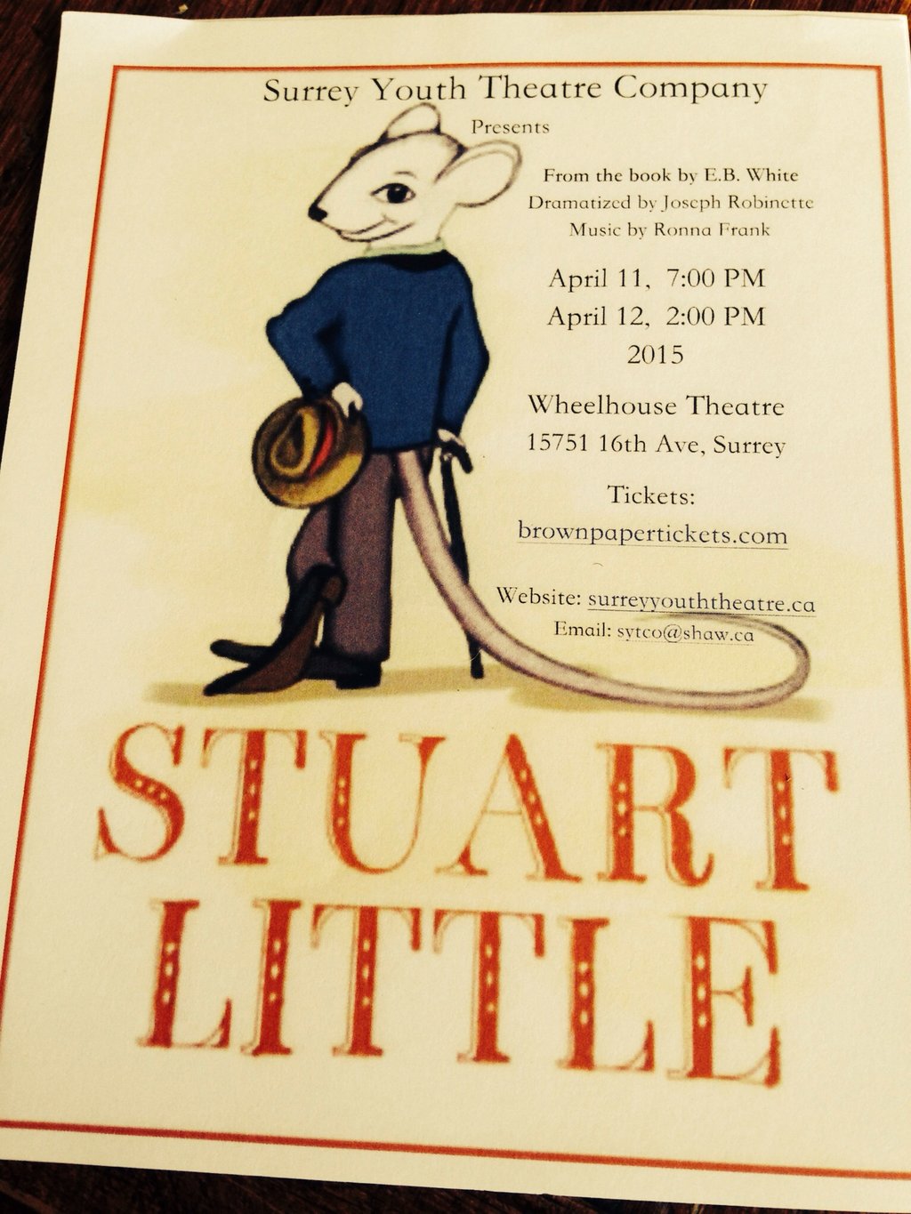 Stuart Little Musical: SYTC performers aged 6 - 17 @ Wheelhouse Theatre Apr 11 2015 - Feb 8th @ Wheelhouse Theatre