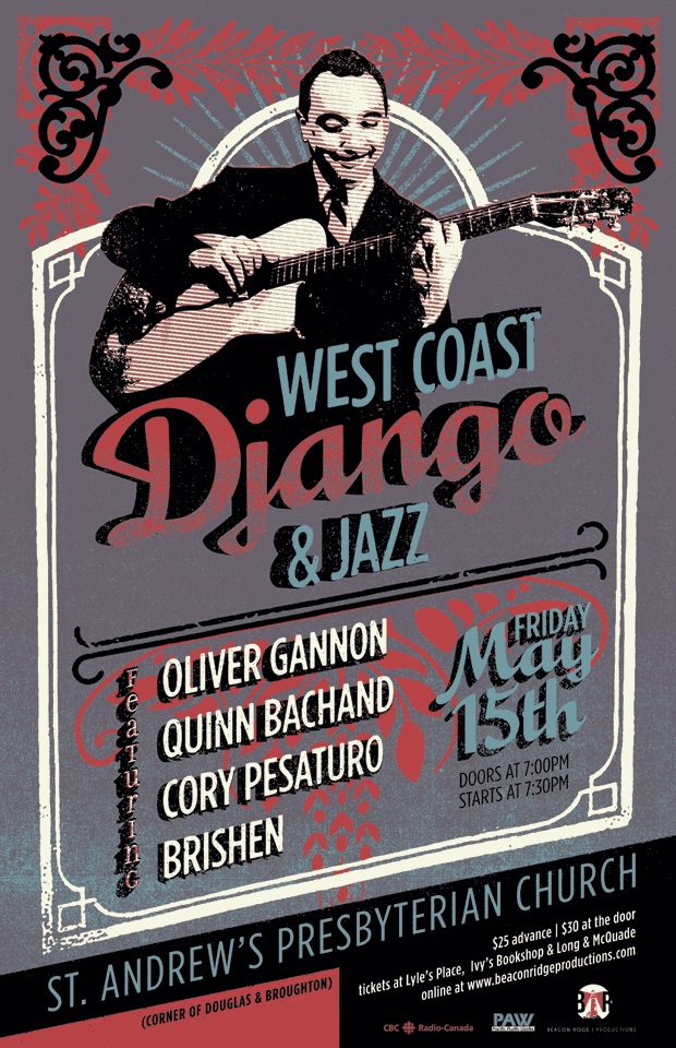 An Evening of World-Class Gypsy Jazz & Jazz Music featuring Juno Award Winning guitarist Oliver Gannon, World Champion in Digital, Acoustic and Jazz Accordion Cory Pesaturo, award winning multi-instrumentalist wunderkind Quinn Bachand and his gypsy jazz ensemble Brishen who received an astounding five nominations at the 2014 Canadian Folk Music Awards!